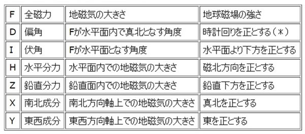 地磁気の成分は、「偏角、伏角、全磁力、水平分力、鉛直分力」の5種類で表現されます。特に、真北と磁北のずれを表す「偏角」は、方位磁石と地図の向きを合わせるために利用され、私たちの生活に直結する重要な情報です。例えば、国土地理院の電子地形図25000には偏角が記載されており、磁北と地図の向きとを正確に合わせることができます。地磁気は、大きさと方向を持つベクトル量ですので、ある場所の地磁気を表すためには、下の要素のうち独立な3つの要素を使わなければなりません。