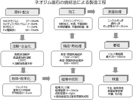 【Sintering】焼結(Sintering)、焼結磁石(Sintered Magnet)「金属やセラミックスの粉末材料を成形機(プレス機)で成形し、それを高温で焼き固める製法のことである。」フェライト磁石、サマコバ磁石、ネオジム磁石の主力の製法でもある。焼結法で製造される磁石を焼結磁石という。次図にネオジム焼結磁石の製造工程の概要を示す。