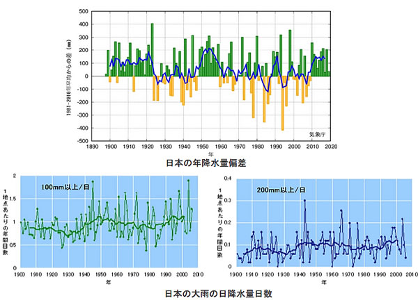 昨今は、ちょっとした大雨を「ゲリラ豪雨」や「異常気象」とよぶ人が多いようです。大雨は昔からしじゅう降りましたが、降水量の統計はどうなっているのか。気象庁はホームページの「異常気象」欄に次下図を載せ、「20世紀初頭の30年間に比べ、最近の30年間で降水量100ミリの日数が約1.2倍に増えました。地球温暖化が関係している可能性があります」と述べています。