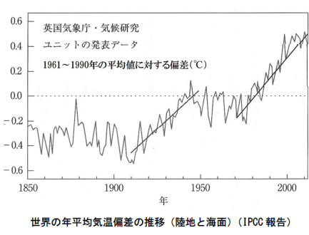 過去の章で何回も出てきていますIPCCによる次図を眺め直せば、そのパターンが見て取れます。こうした自然変動に加え、とりわけ1940年以降は、都市化とデータ加工、人為的CO2の三つが効いて、次図のパターンができ上がったと考えられます。
