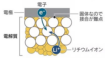 全固体電池の大きな課題の一つは、電解質に固体材料を使うため、電極と電解質との接合が悪く、その界面で電荷を運ぶイオンの伝導性が低いことです。したがって、固体電解質の材料研究とその量産技術の開発の成否がEV普及のための分水嶺かもしれません。