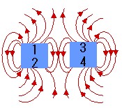 巻数が1000回の2次コイルには何ボルトの電圧が発生するか? 1ボルト(V) 10ボルト(V) 100ボルト(V) 1000ボルト(V) [問題9] ネオジム磁石は温度が上がるとどうなるか? 残留磁束密度Brが大きくなる 保磁力Hcjが低下する 最大エネルギー積(BH)maxが大きくなる 磁気特性は変化しない [問題10] 下図の2つの磁石の磁力線分布で、1,2,3,4,に相当する極名の組合せで正しいものはどれか? N,S,N,S N,S,S,N S,N,S,N S,N,N,S |