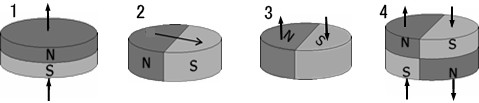 (イ)と(ロ)の組合せで正しい答えはどれか? 電場と磁場 電圧と磁束 電流と磁化 電気と磁気 [問題4] 永久磁石を加熱して磁力をなくすことを何と呼ぶか? 着磁 減磁 界磁 消磁 [問題5] CGS単位系において保磁力Hcjの単位はどれか? ガウス(G) テスラ(T) エルステッド(Oe) ヘンリー(H) [問題6] 下図の円柱型磁石の着磁方法で正しい名称順はどれか? 厚み方向着磁、径方向着磁、片面2極着磁、両面4極着磁 径方向着磁、厚み方向着磁、片面2極着磁、両面4極着磁 片面2極着磁、両面4極着磁、厚み方向着磁、径方向着磁 両面4極着磁、径方向着磁、厚み方向着磁、片面2極着磁 [問題7] 透磁率(磁力線の通り易さ)を表す記号(単位ではない)はどれか? δ Ω ρ μ [問題8] ネオジム磁石を組み込んだボイスコイルモーター(VCM)が使われている製品はどれか? HDD GPS ABS DVD [問題9] 室温でなるべく大きい磁力を必要とする時、どの磁石が最適か? SS30(サマリウムコバルト磁石) Neo40H(ネオジム磁石) Neo40SH(ネオジム磁石) Neo50(ネオジム磁石) [問題10] 寸法が100x100x100mmの着磁された角型ネオジム磁石にロープをつけて、鋼材に吸着させると