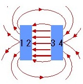 赤い曲線(曲線1)全体を何と呼ぶか? B-H曲線 G-H曲線 J-H曲線 U-H曲線 [問題5] 磁石の密度を表す単位はどれか? g/cm g/cm2 g/cm3 g/cm4 [問題6] 磁石の磁気特性を測定する計測器ではないものはどれか? BHトレーサー マイクロメーター ガウスメーター フラックスメーター [問題7] エネルギー積(BH)maxがが最も大きい磁石はどれか? Neo38SH Neo40UH Neo50 Neo45H [問題8] ネオジム磁石を組み込んだボイスコイルモーター(VCM)が使われている製品はどれか? HDD GPS ABS DVD [問題9] なるべく高温度でも使えるネオジム磁石の選定基準で正しいものはどれか? 表面磁束密度Bsの大きい磁石 残留磁束密度Brの大きい磁石 保磁力Hcjの大きい磁石 最大エネルギー積(BH)maxの大きい磁石 [問題10] 下図の2つの磁石の磁力線分布で、1,2,3,4,に相当する極名の組合せで正しいものはどれか? S,N,S,N S,N,N,S N,S,N,S N,S,S,N |